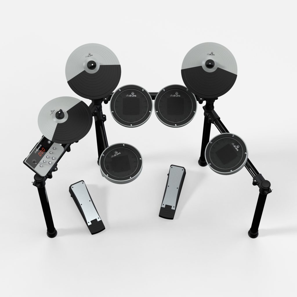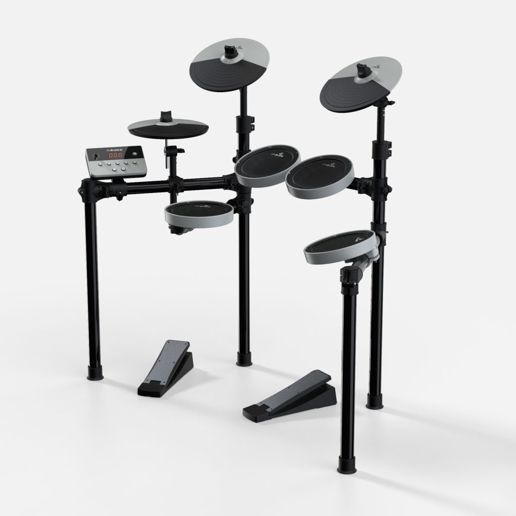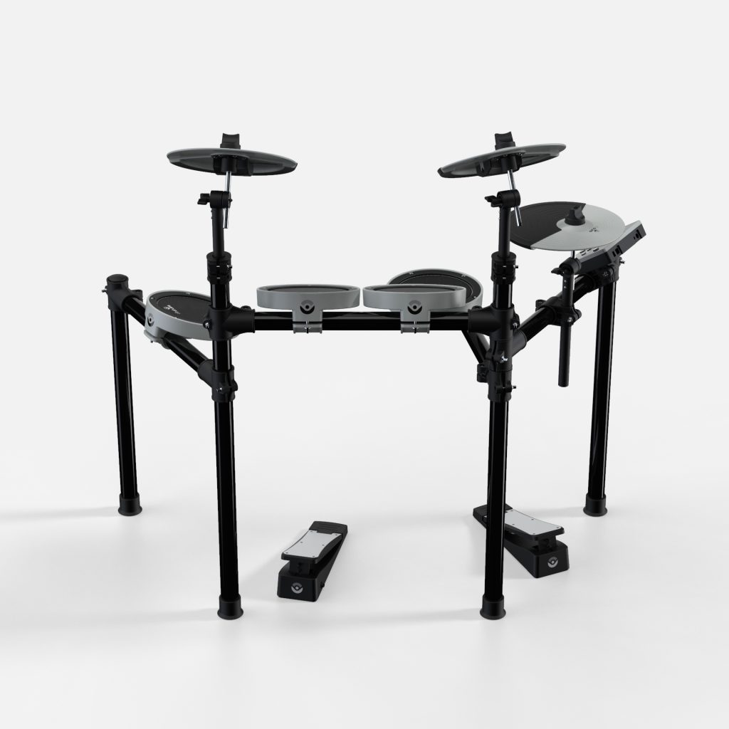 Snare, toms, hi-hat, crash, ride y bombo en un setup compacto que cabe en cualquier habitación. Lista para tocar en minutos.